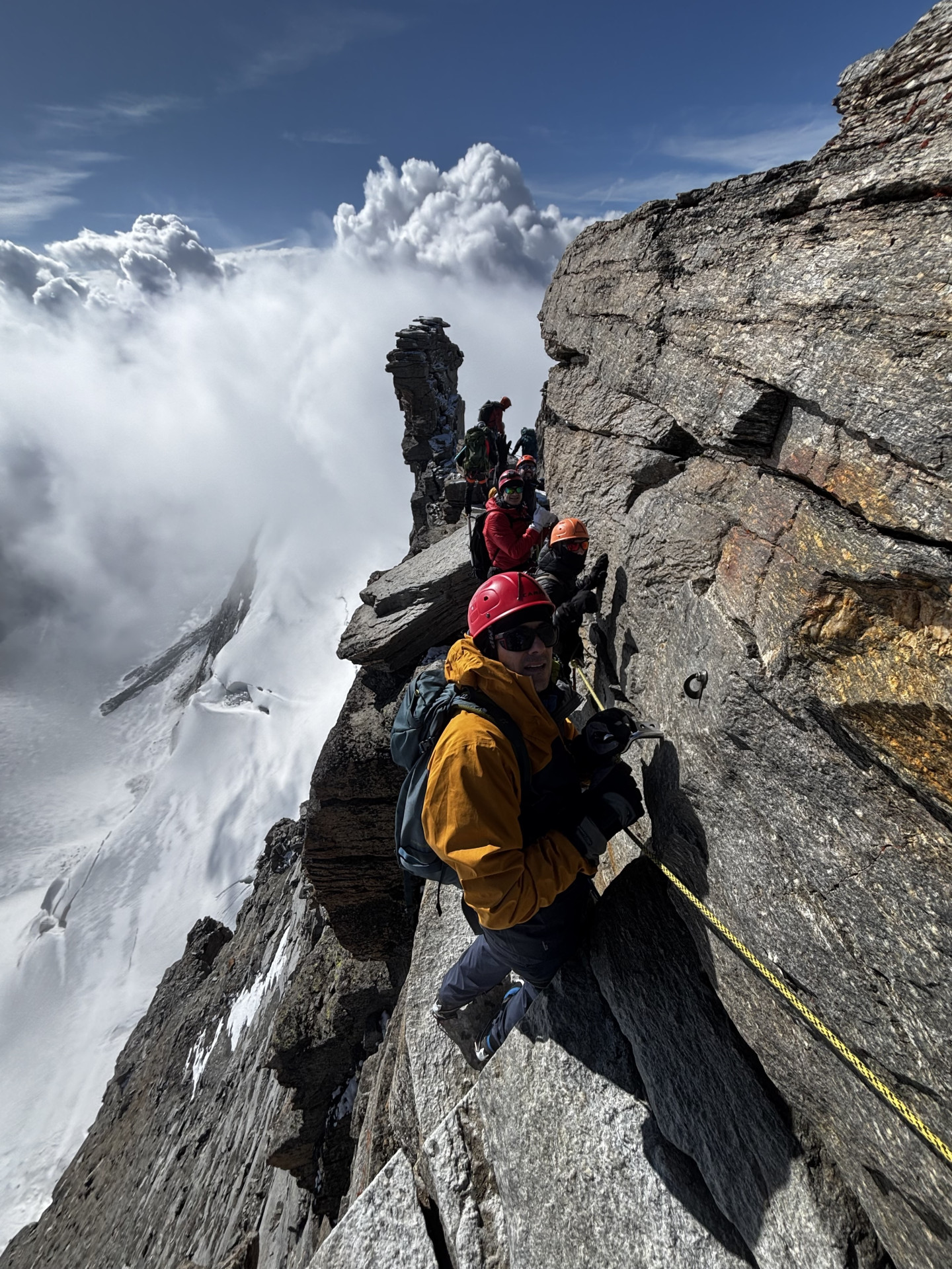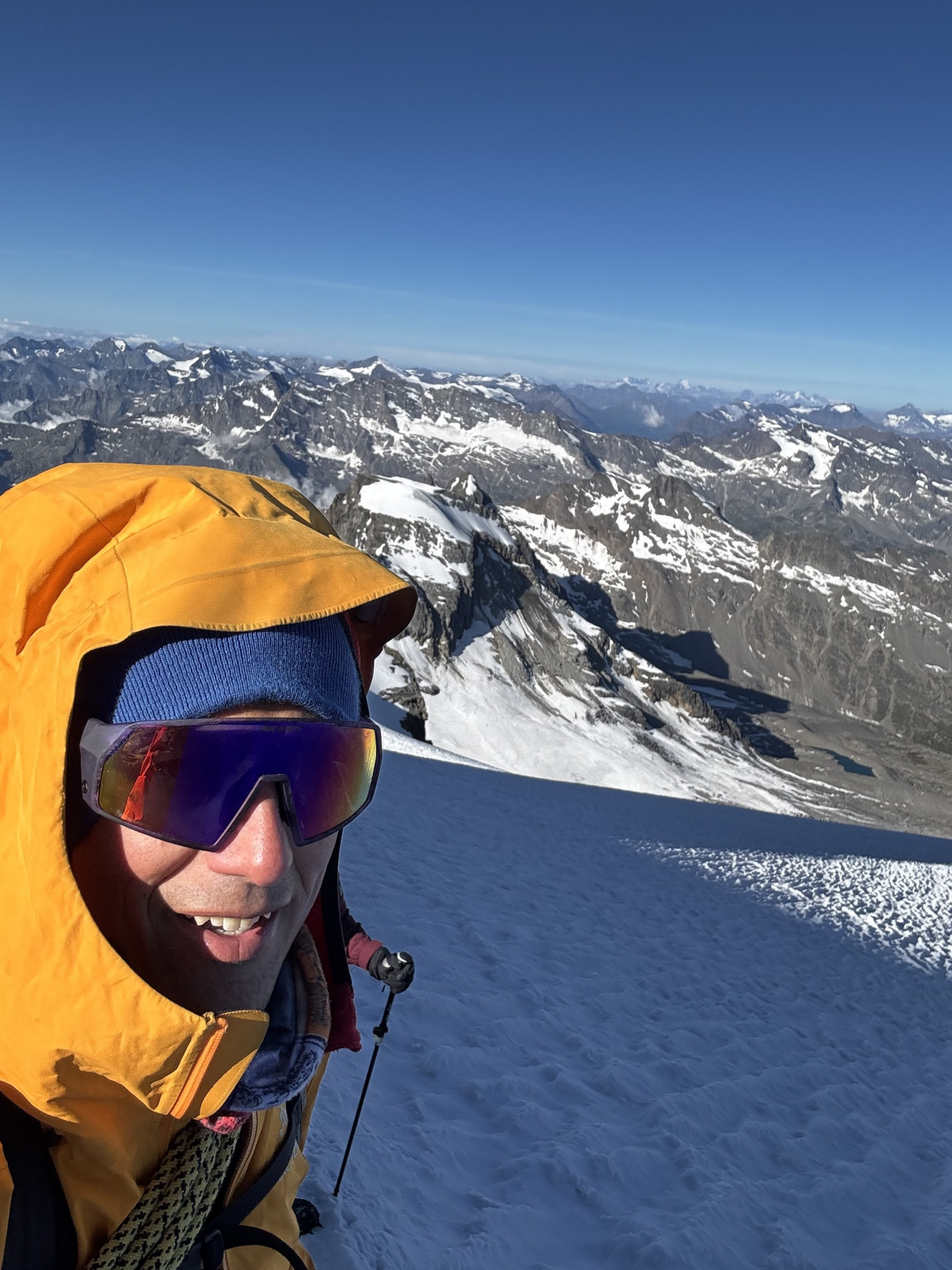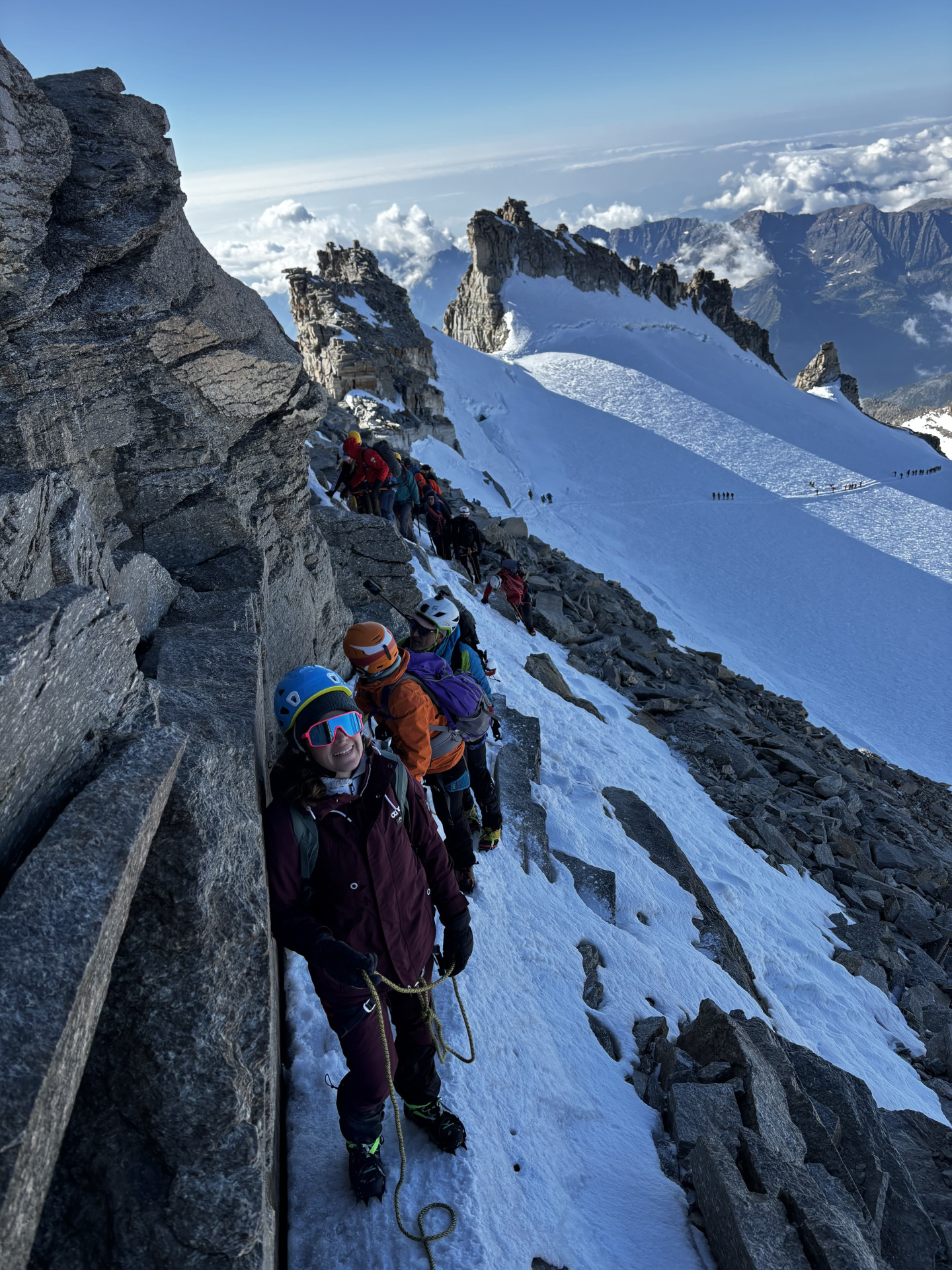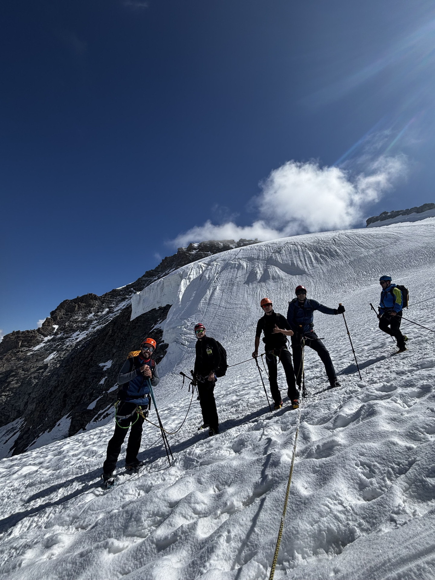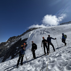 La salita si sviluppa quindi su ghiacciaio e terreno misto, con un percorso progressivo che permette di entrare pienamente nell’ambiente alpino d’alta quota. L’itinerario, lungo ma mai eccessivamente tecnico, richiede comunque buona preparazione fisica, passo sicuro e confidenza con l’ambiente di montagna.